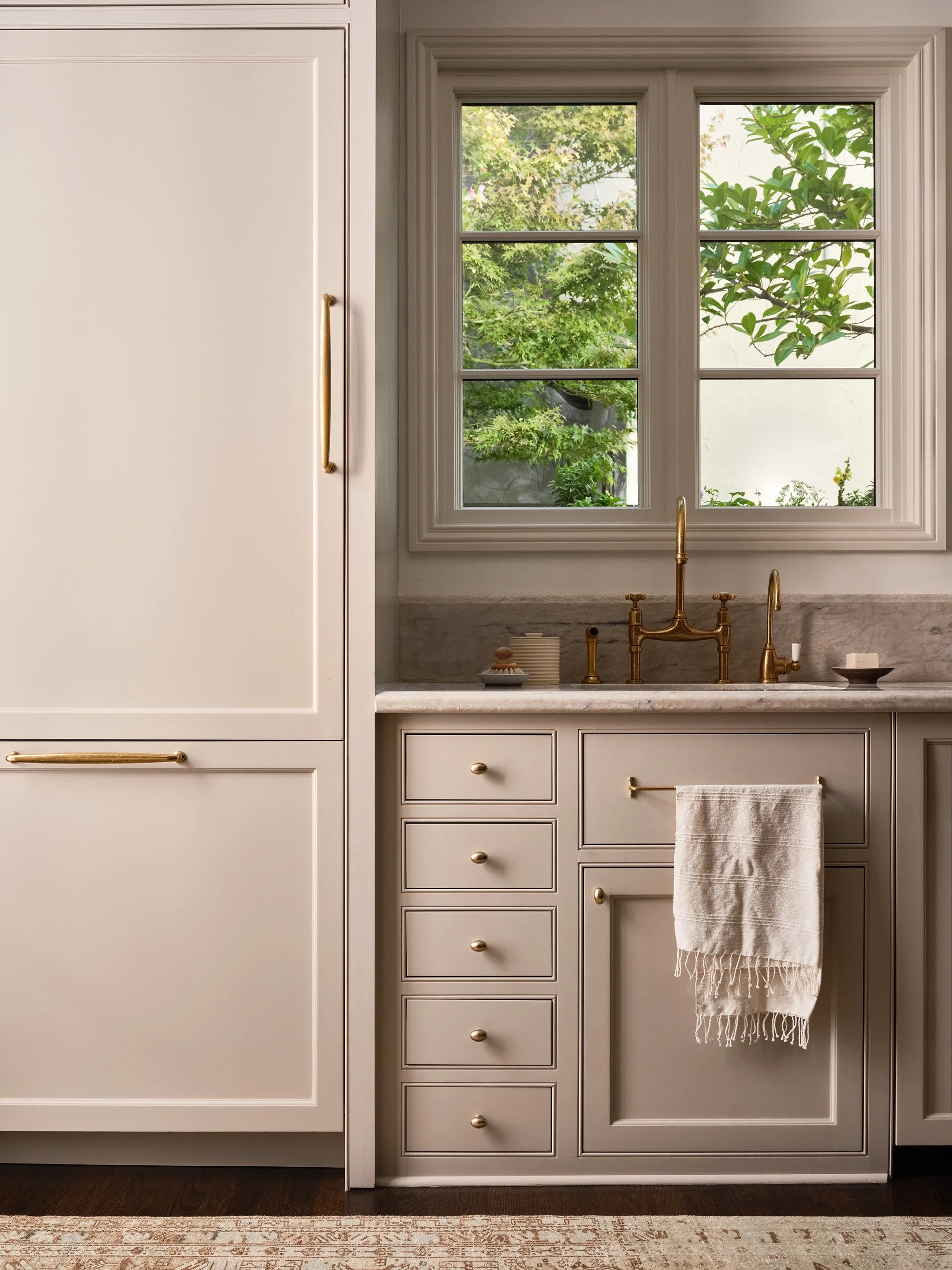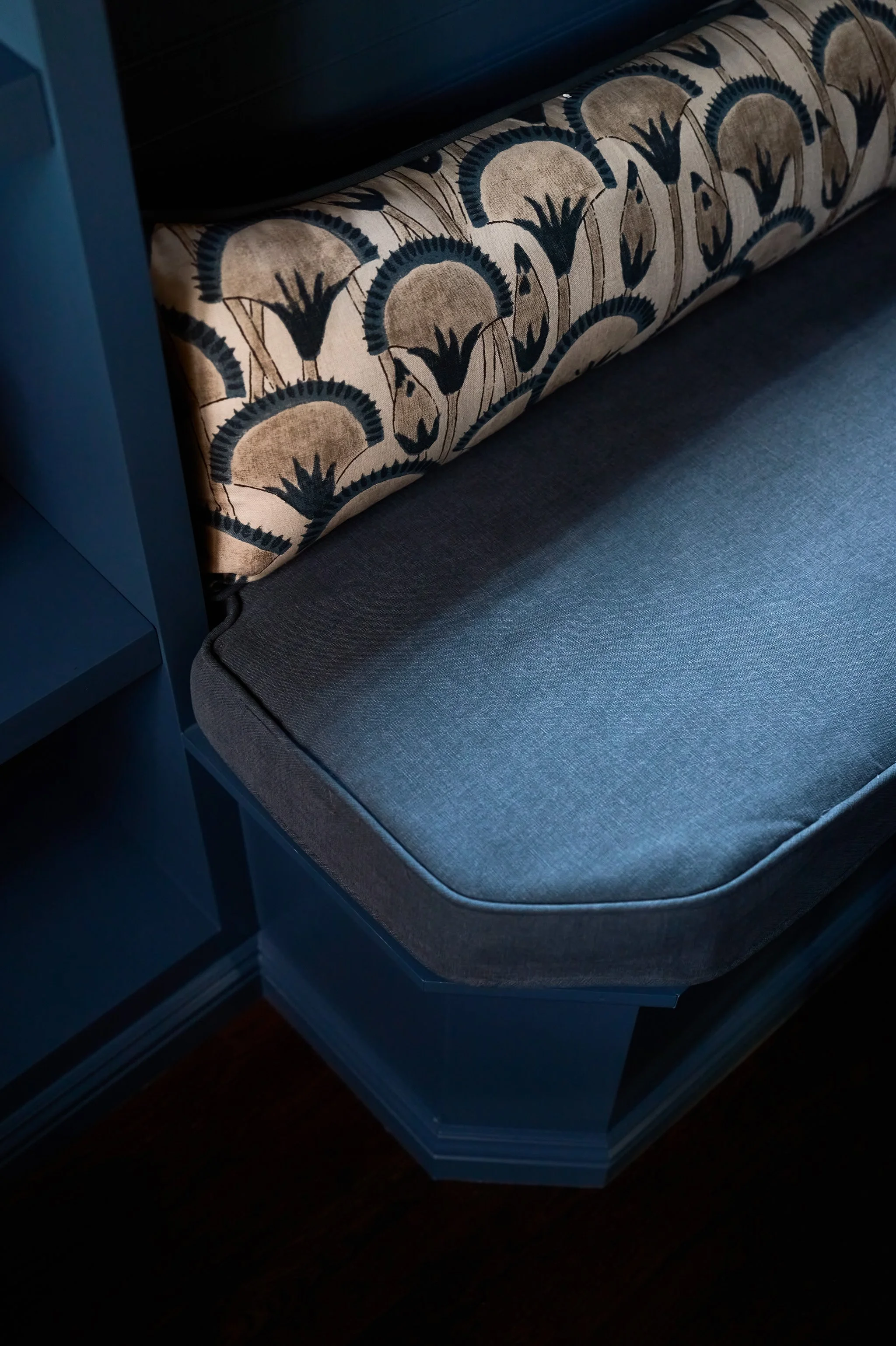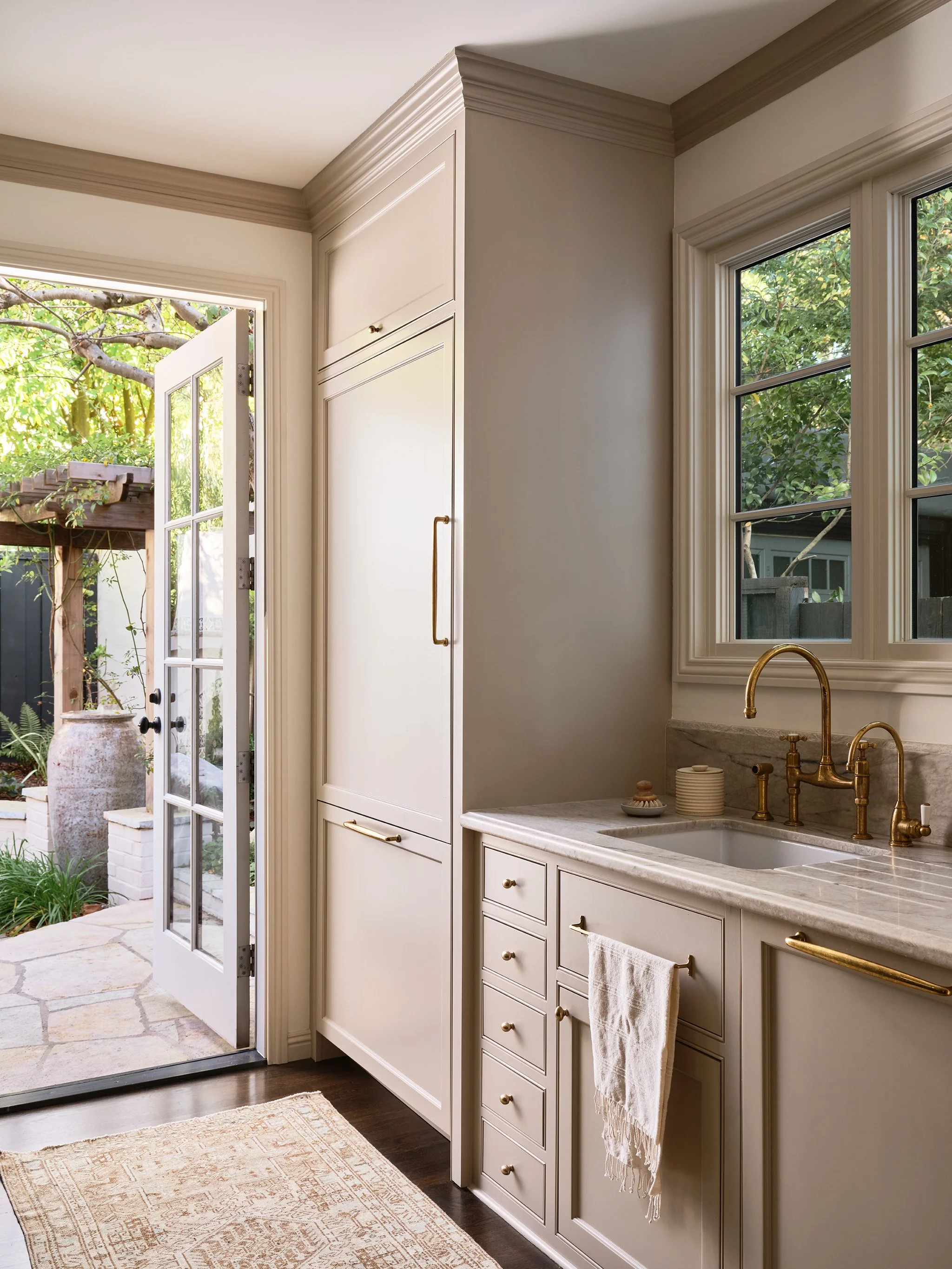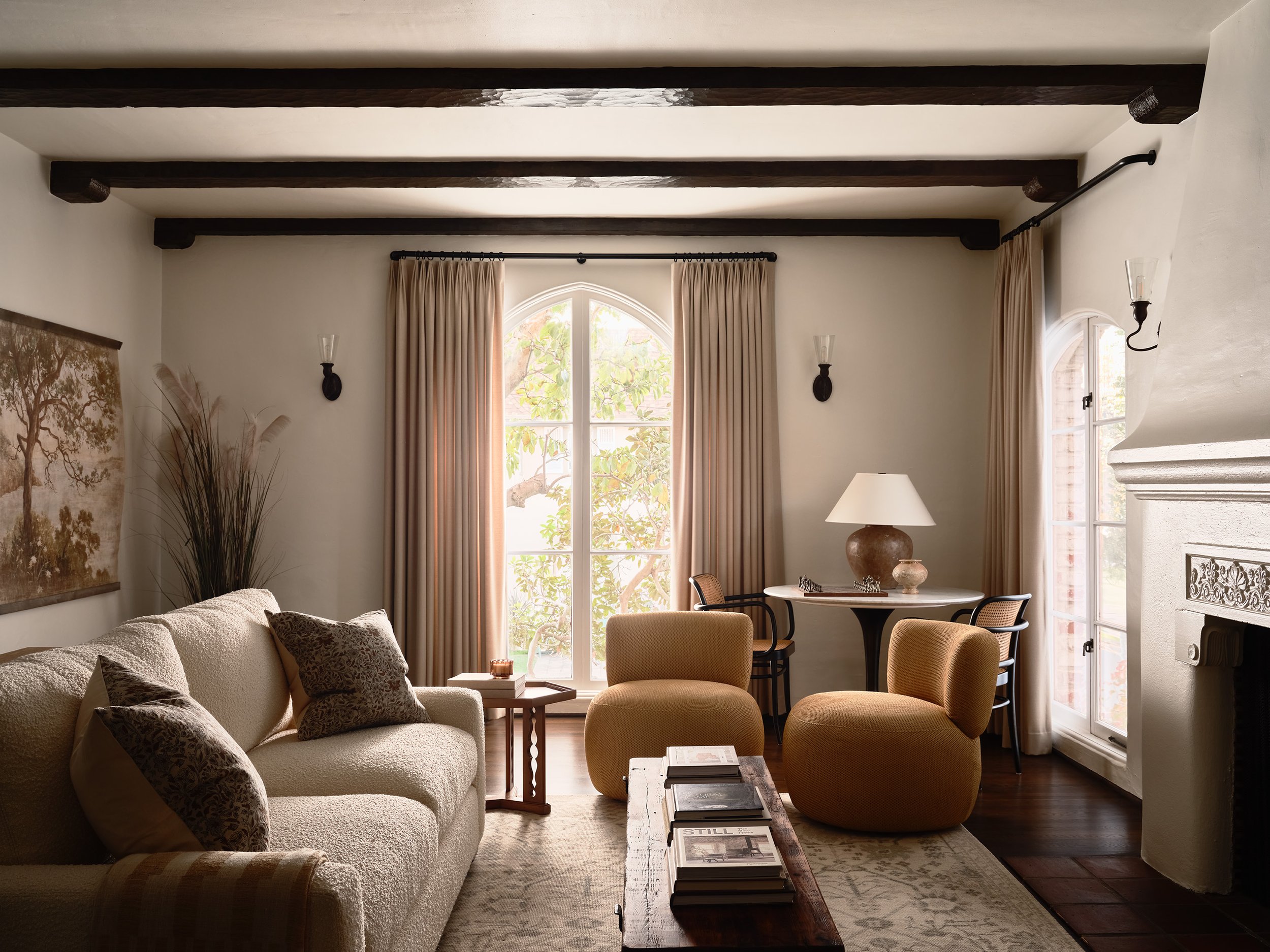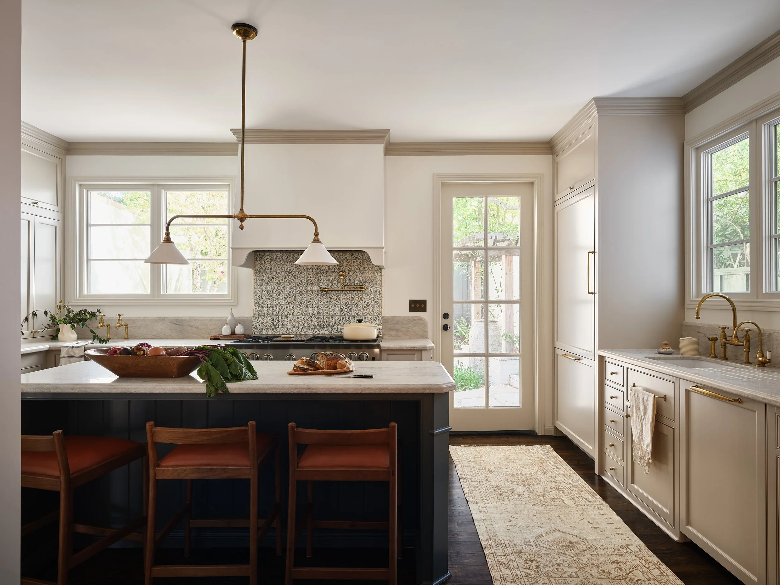 This Spanish-Revival home delights with architectural charm at every corner. While we preserved and improved upon the historic features and design details, we made significant updates in order to make it functional for the family and their young children. Consistent with Spanish-Revival architecture, the house has beautiful arched doorways and a stunning fireplace with elegant curves. We wanted to echo the geometries and soft forms in the kitchen remodel, while also drawing inspiration from traditional English design. The kitchen island provides a place for the family to gather and host friends, while adding additional storage. In the dining room, we added custom built-ins with banquette seating. We went with a moody color palette, which adds to the intimacy of the space.