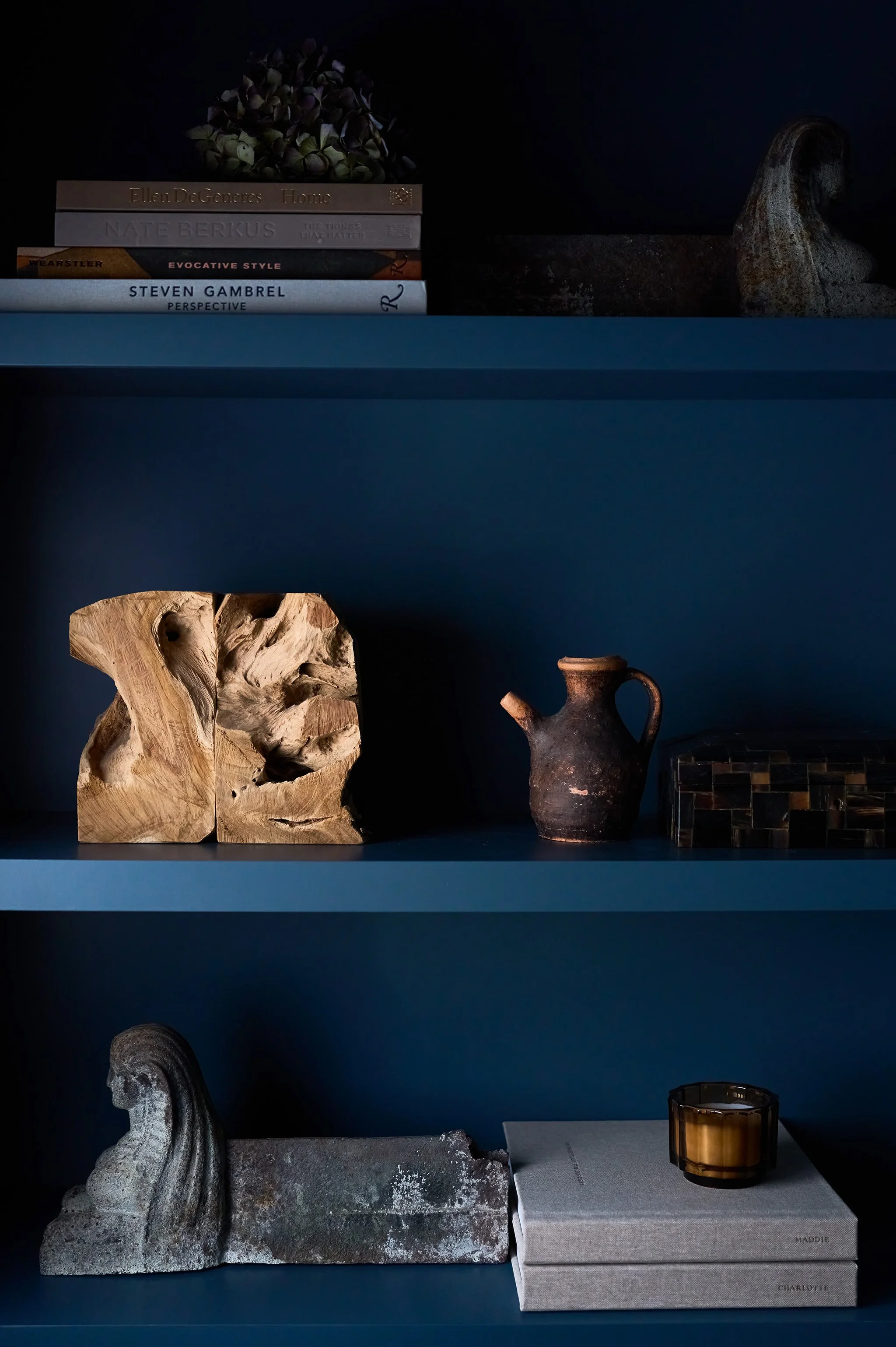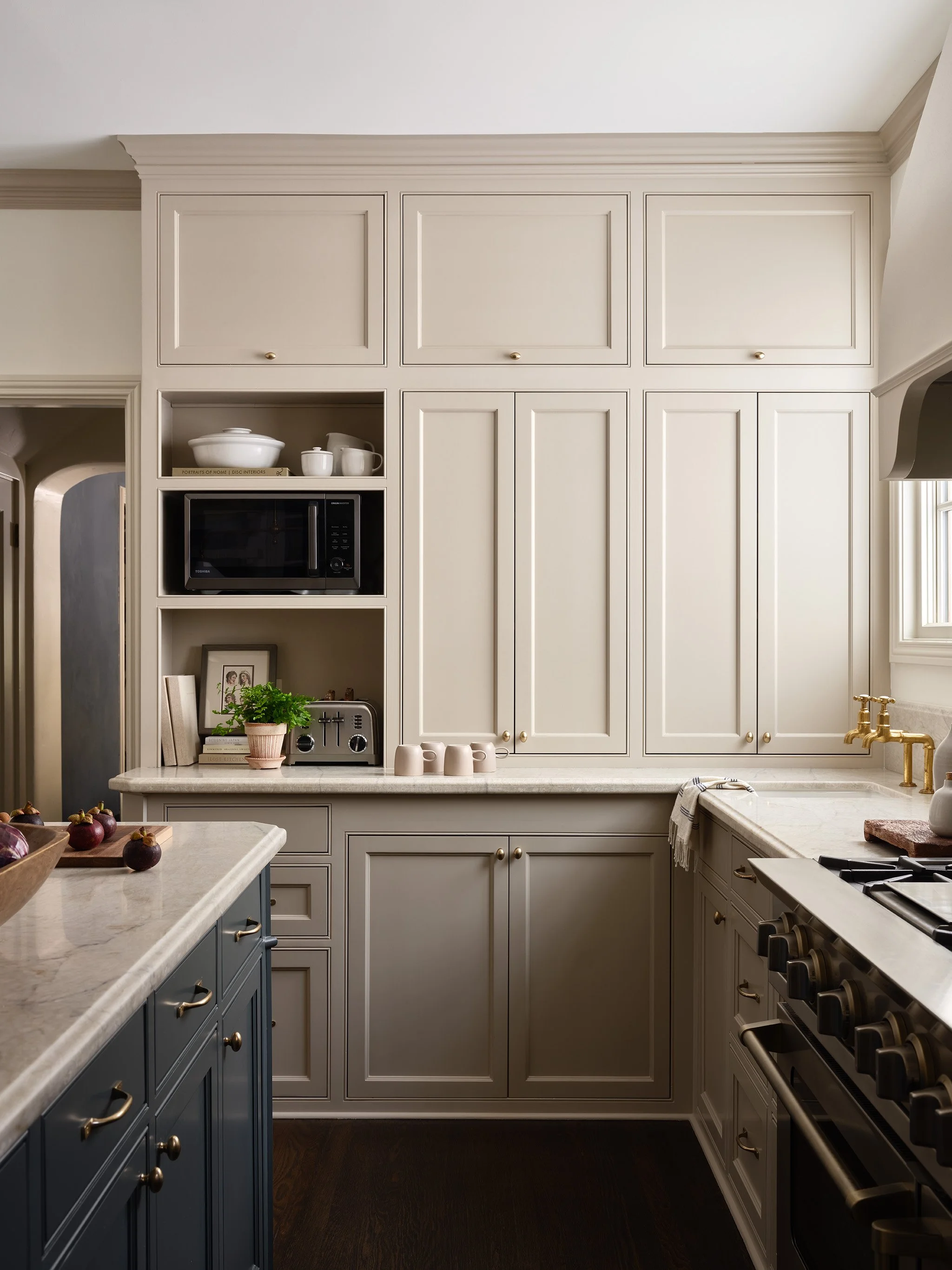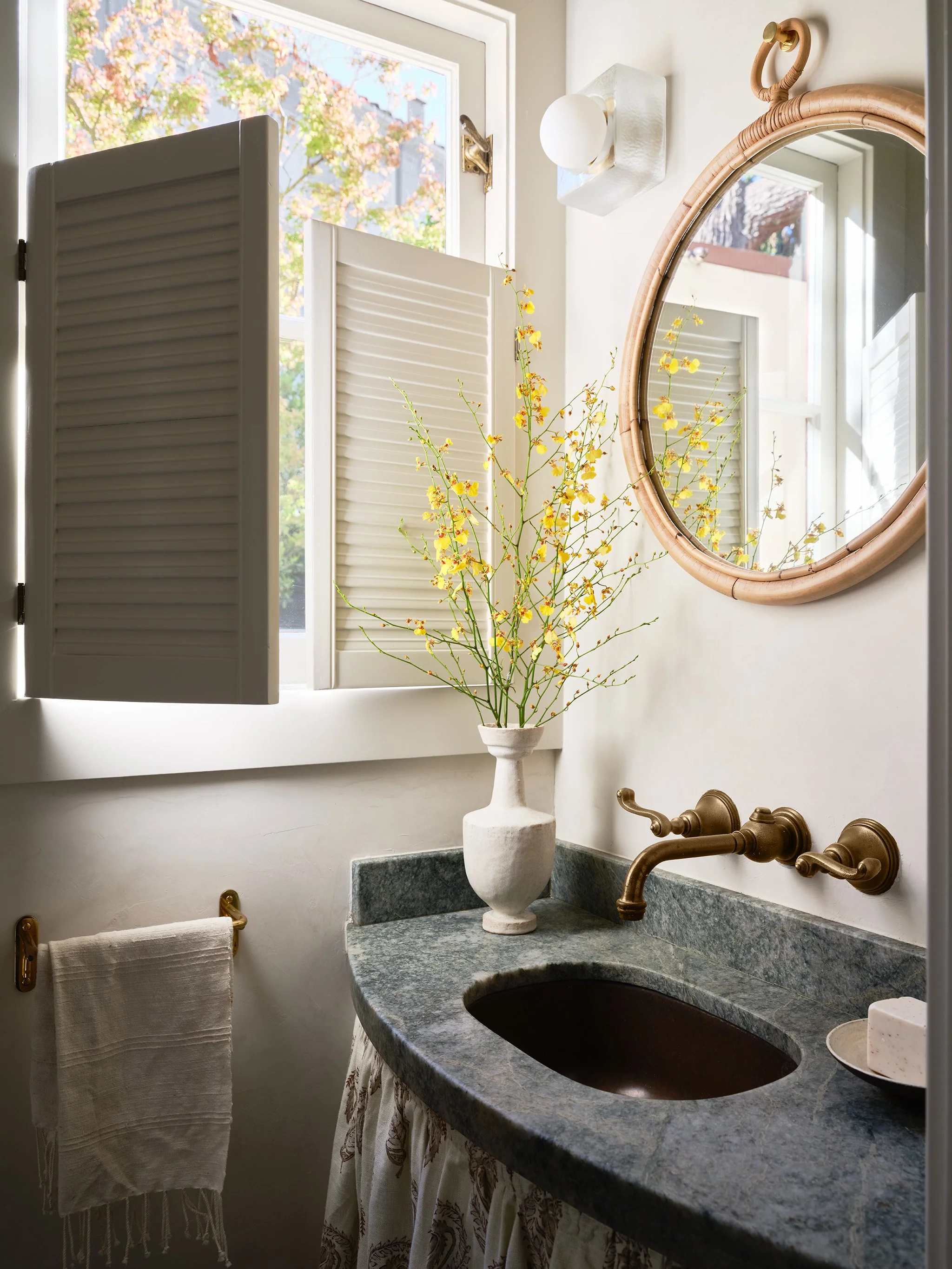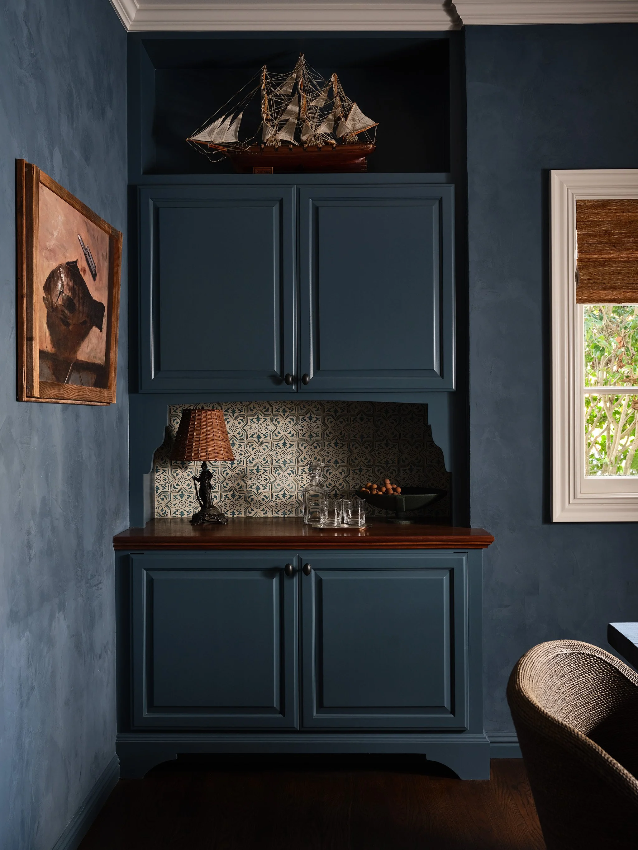 This Spanish-Revival home delights with architectural charm at every corner. While we preserved and improved upon the historic features and design details, we made significant updates in order to make it functional for the family and their young children. Consistent with Spanish-Revival architecture, the house has beautiful arched doorways and a stunning fireplace with elegant curves. We wanted to echo the geometries and soft forms in the kitchen remodel, while also drawing inspiration from traditional English design. The kitchen island provides a place for the family to gather and host friends, while adding additional storage. In the dining room, we added custom built-ins with banquette seating. We went with a moody color palette, which adds to the intimacy of the space.