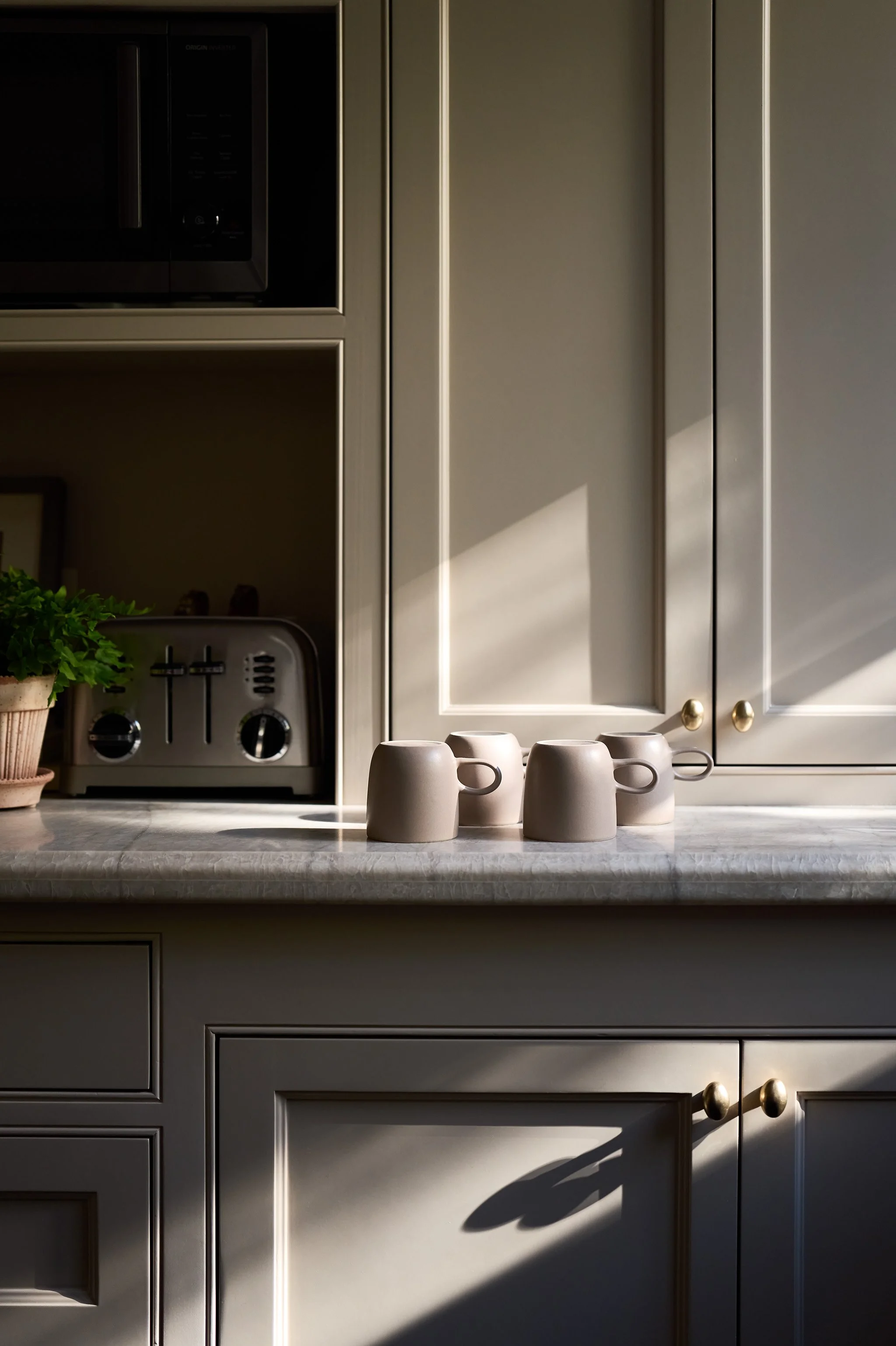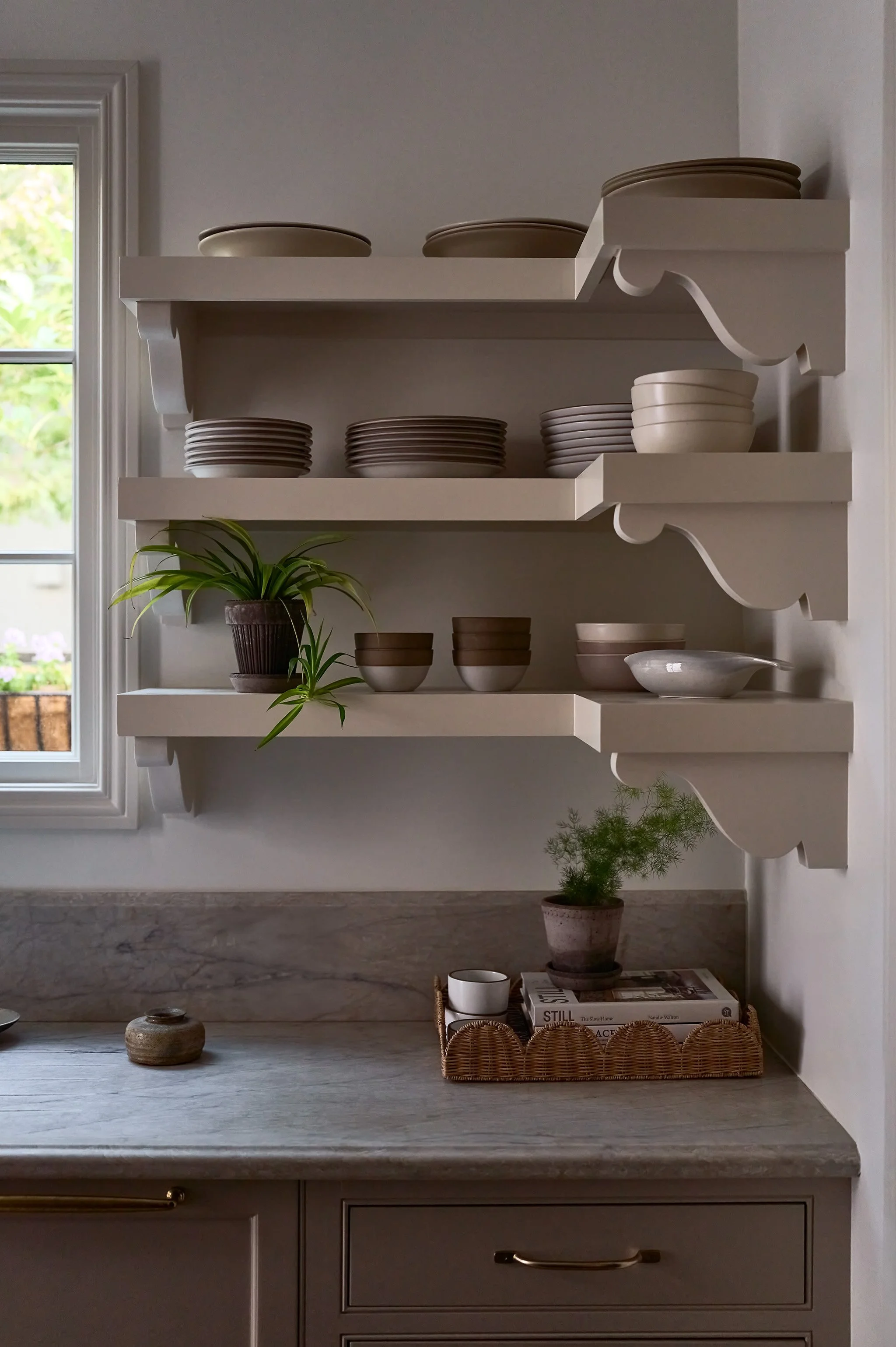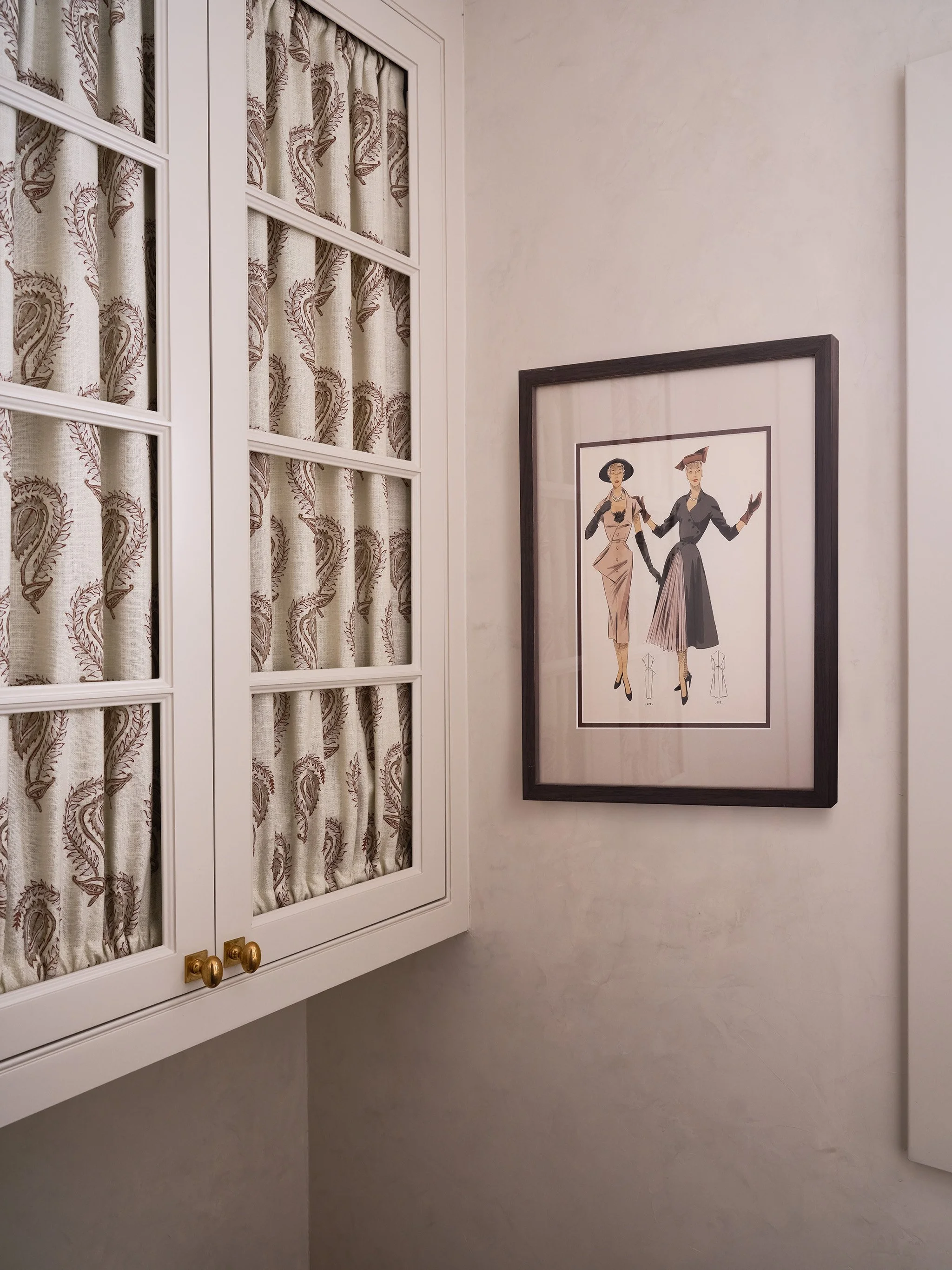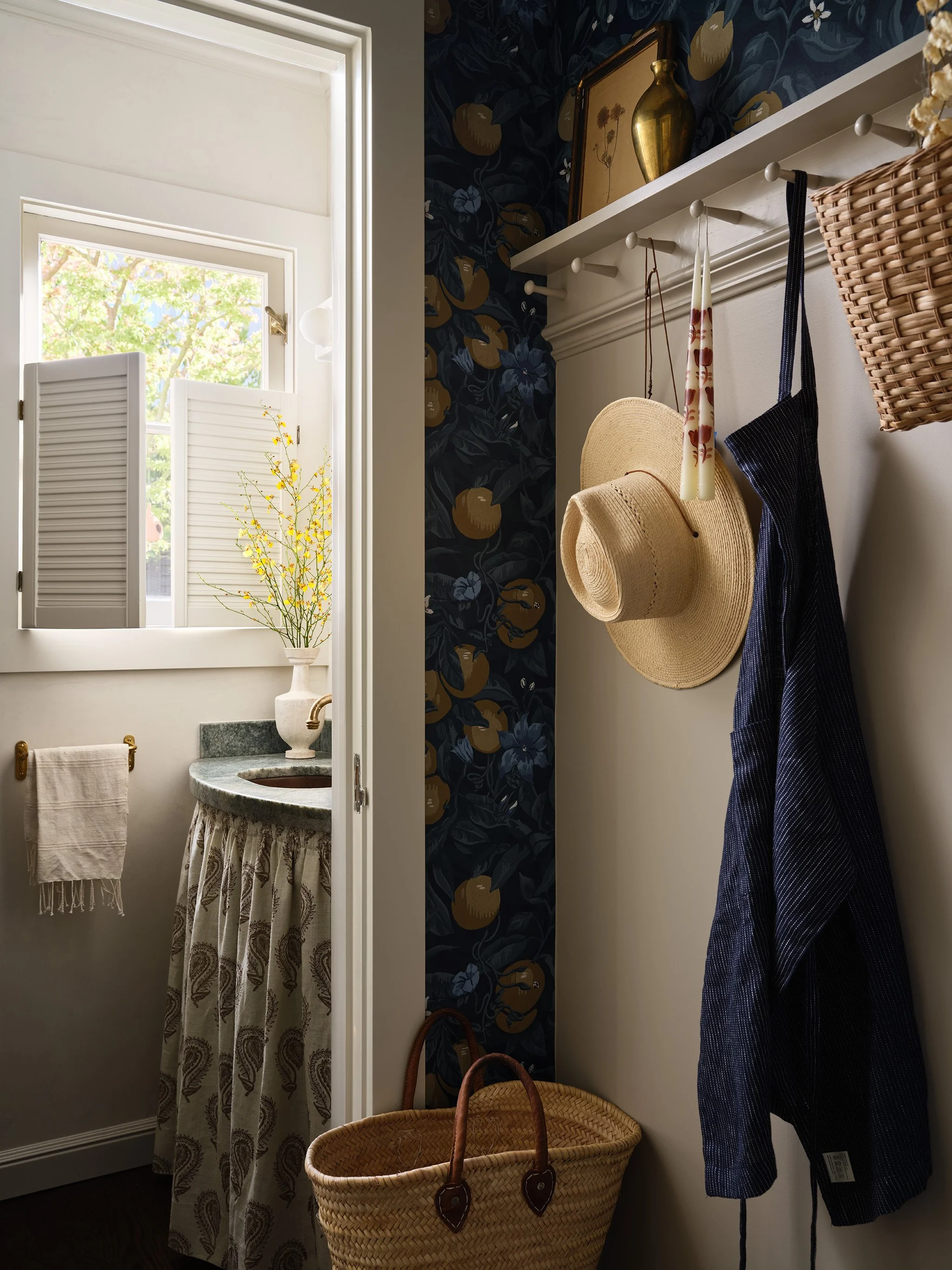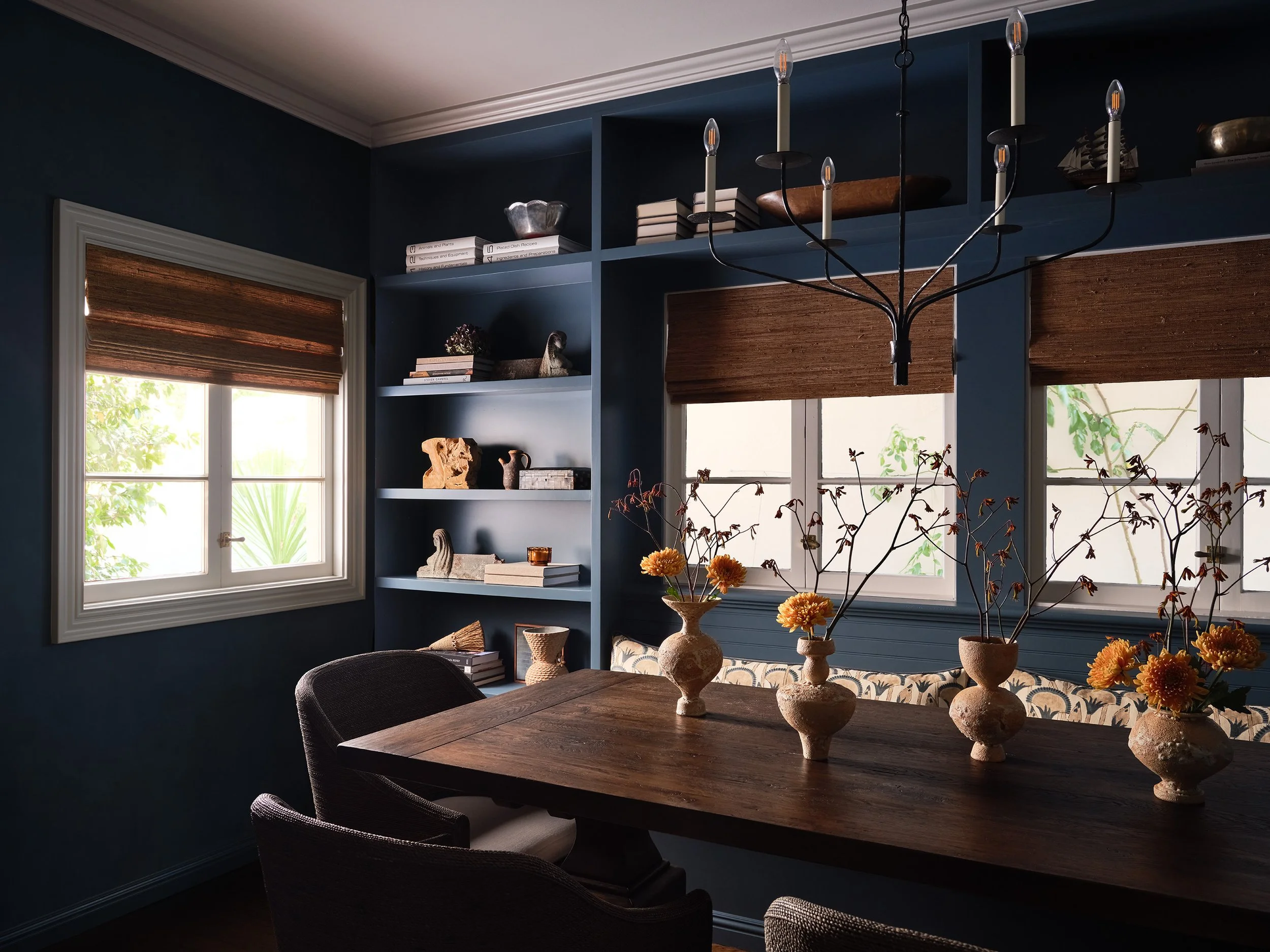This Spanish-Revival home delights with architectural charm at every corner. While we preserved and improved upon the historic features and design details, we made significant updates in order to make it functional for the family and their young children. Consistent with Spanish-Revival architecture, the house has beautiful arched doorways and a stunning fireplace with elegant curves. We wanted to echo the geometries and soft forms in the kitchen remodel, while also drawing inspiration from traditional English design. The kitchen island provides a place for the family to gather and host friends, while adding additional storage. In the dining room, we added custom built-ins with banquette seating. We went with a moody color palette, which adds to the intimacy of the space.