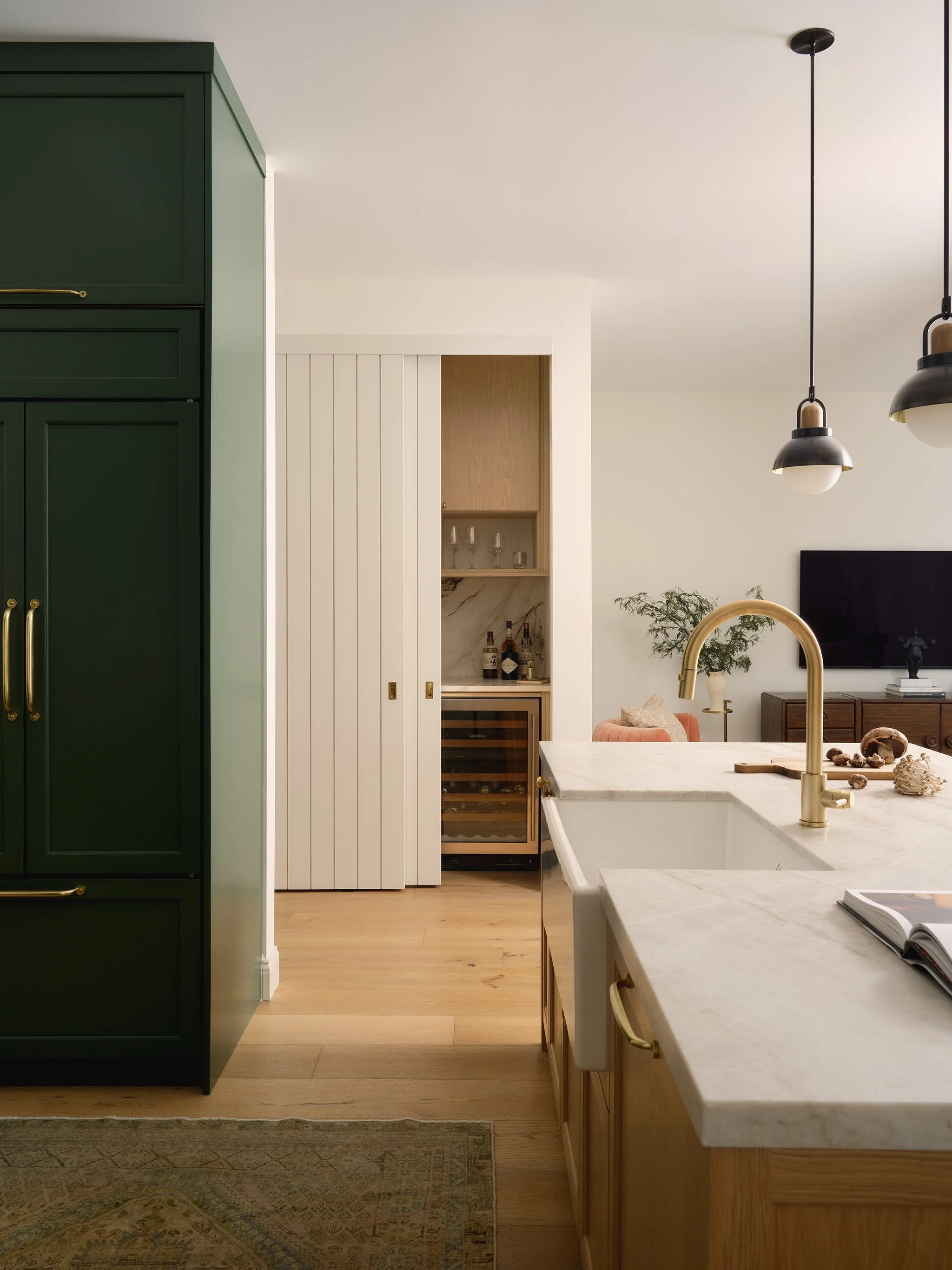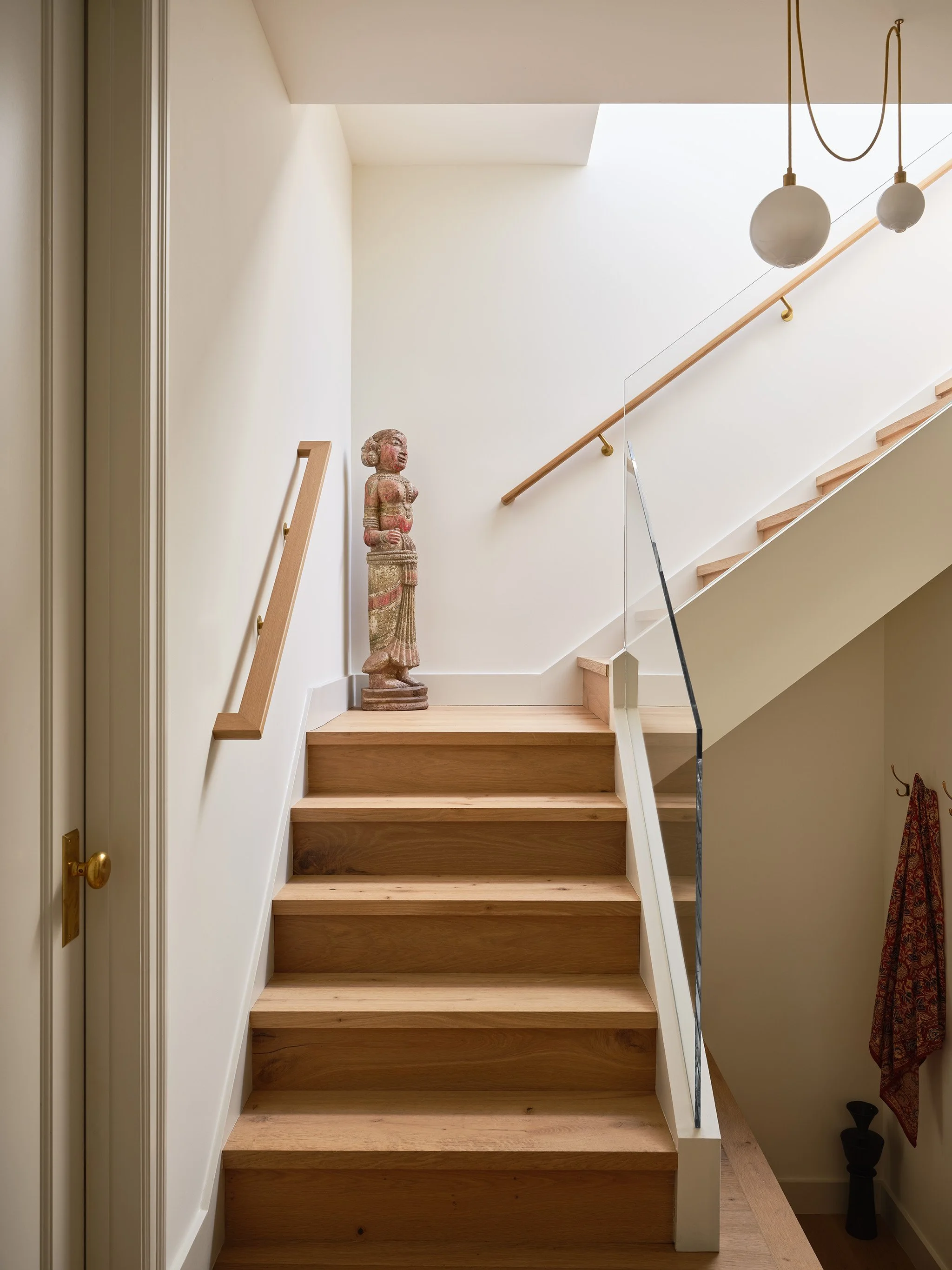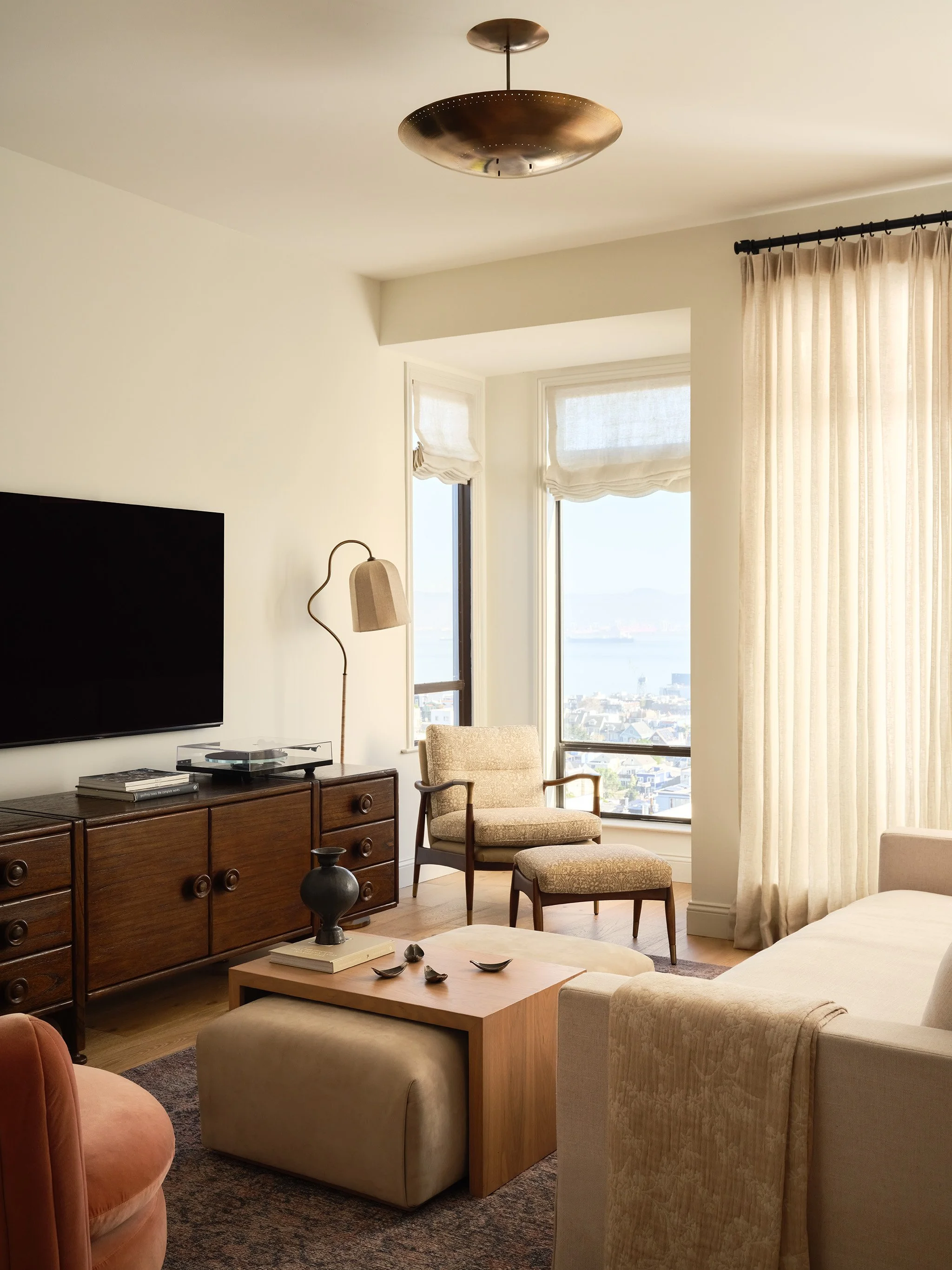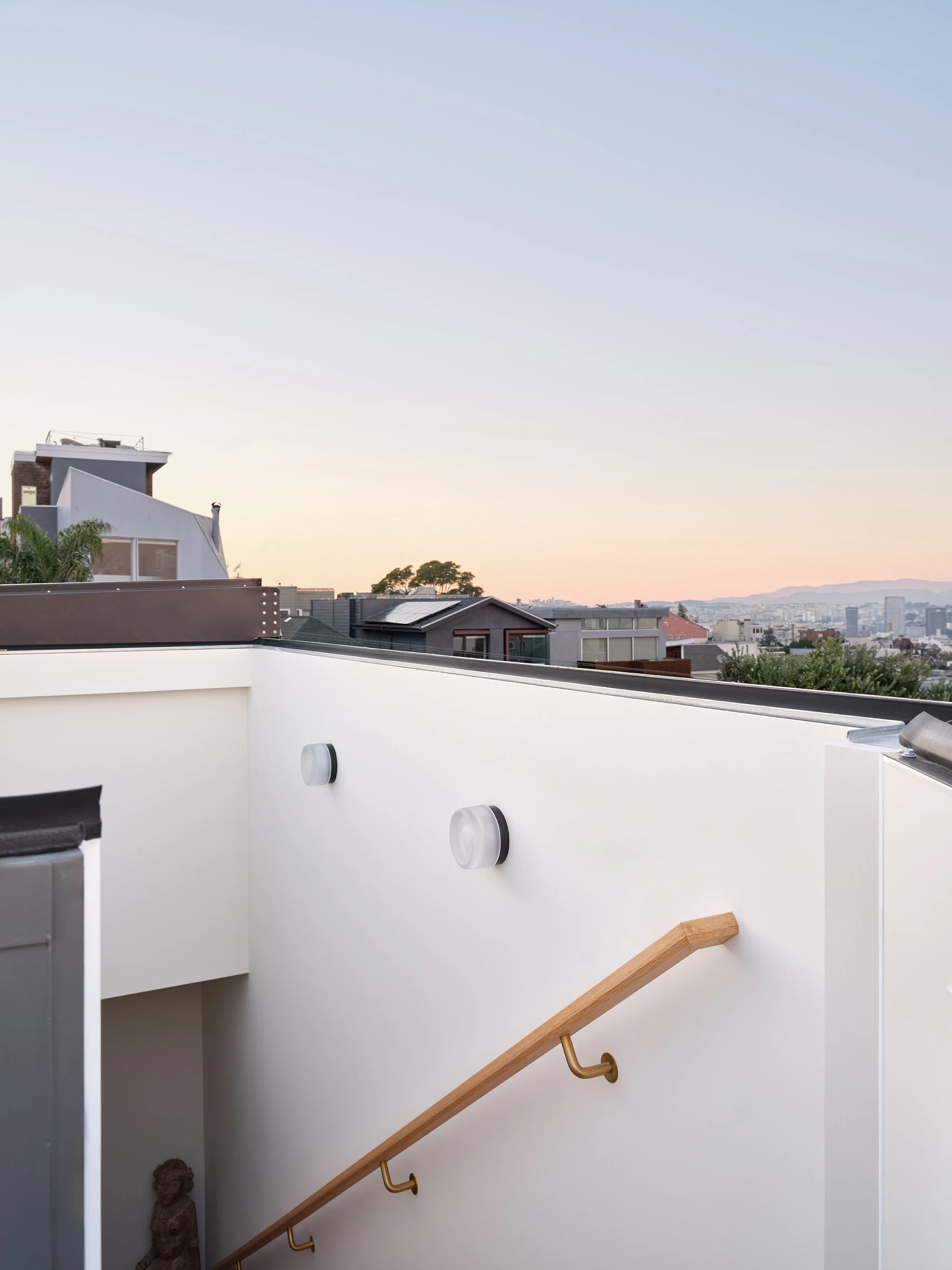This project was a full gut renovation, including the kitchen, living and dining rooms, two bathrooms, and the stairway connecting three levels. The home, with sweeping views of the San Francisco Bay, now opens up to those vistas from the main living spaces and rooftop patio. Designed for an adventurous couple who love to travel and cook, the space blends modern, light-filled interiors with rich colors, textures, and personal pieces reflecting their Indian heritage and global travels.