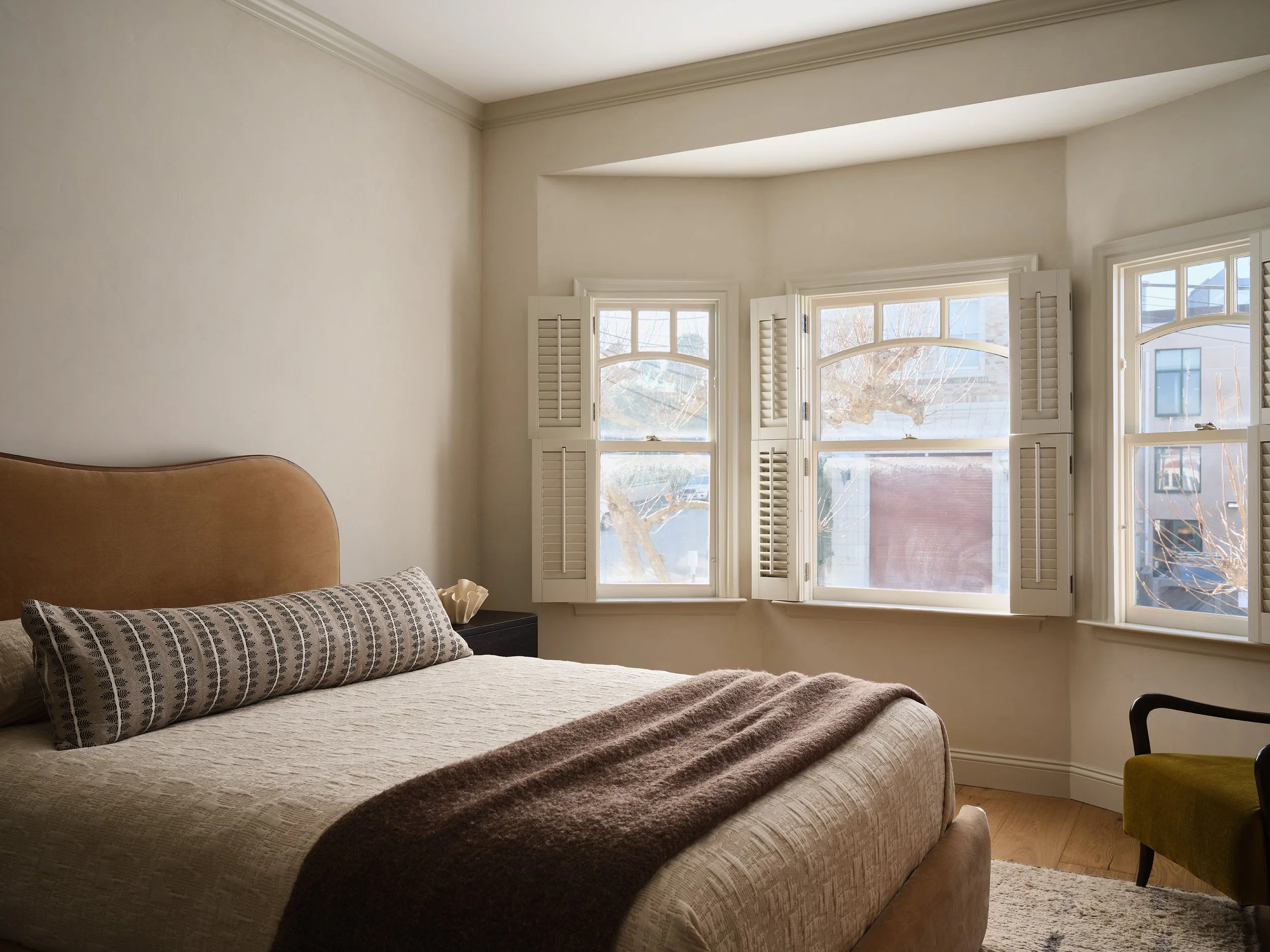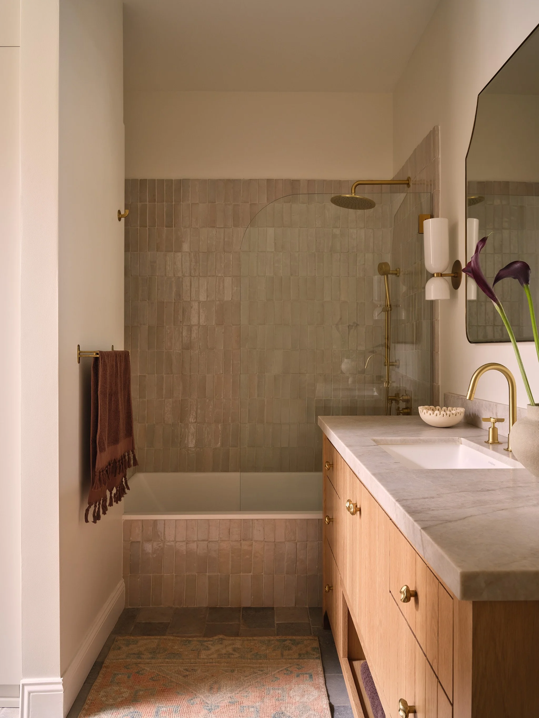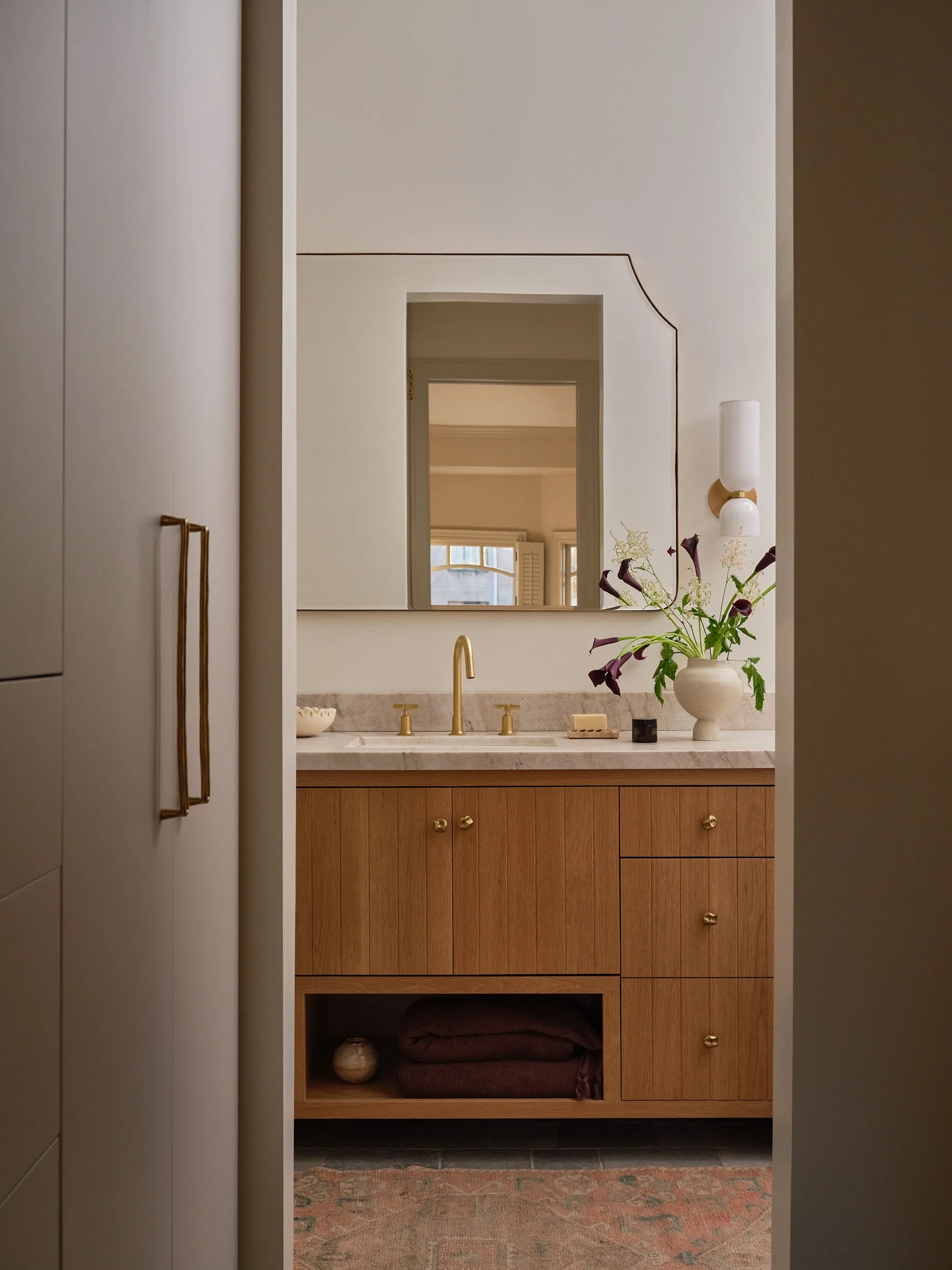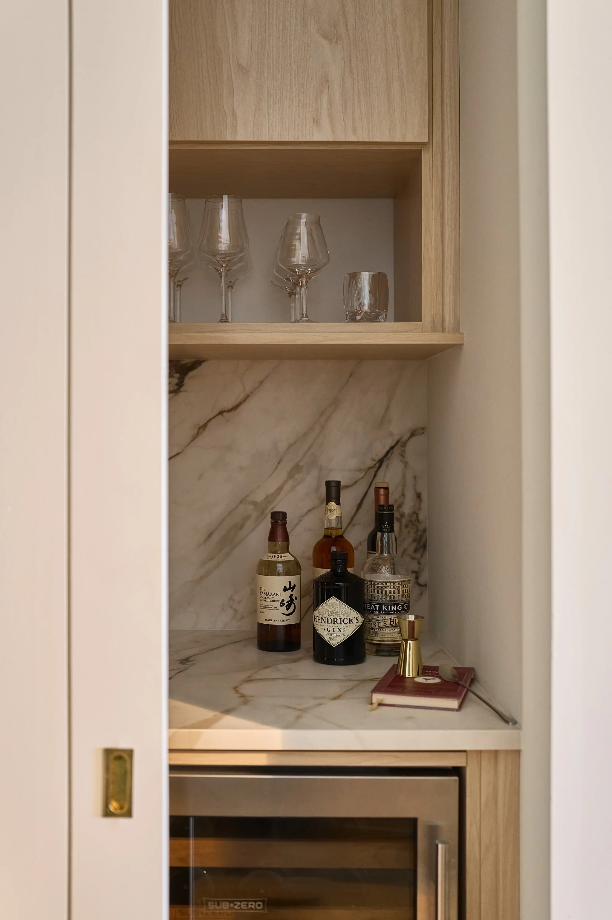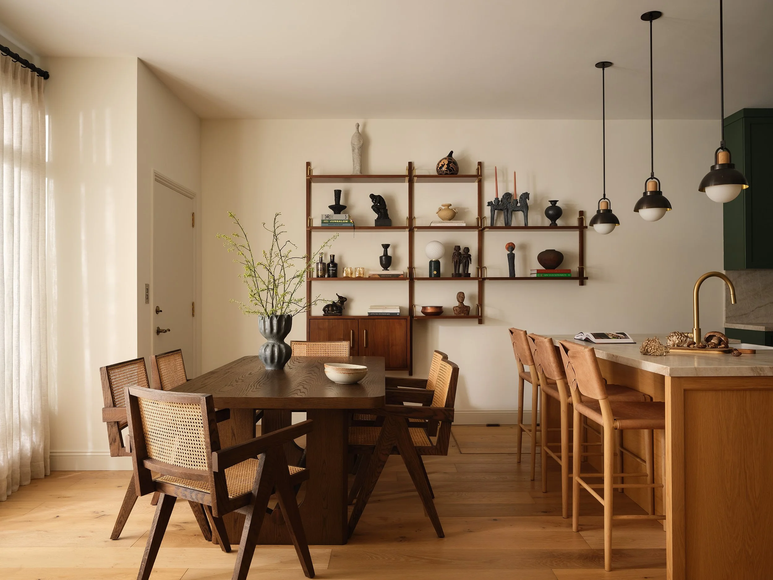 This project was a full gut renovation, including the kitchen, living and dining rooms, two bathrooms, and the stairway connecting three levels. The home, with sweeping views of the San Francisco Bay, now opens up to those vistas from the main living spaces and rooftop patio. Designed for an adventurous couple who love to travel and cook, the space blends modern, light-filled interiors with rich colors, textures, and personal pieces reflecting their Indian heritage and global travels.