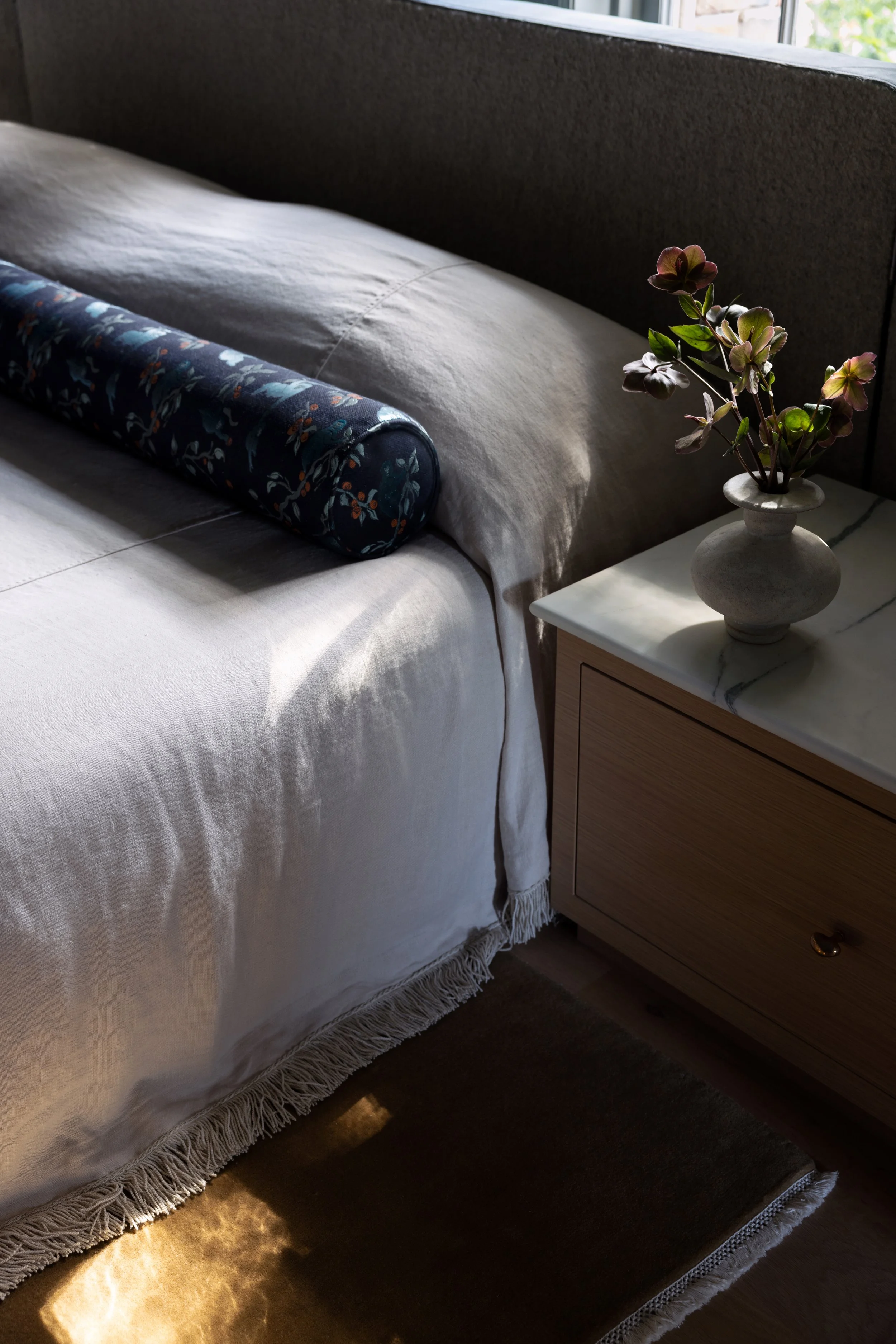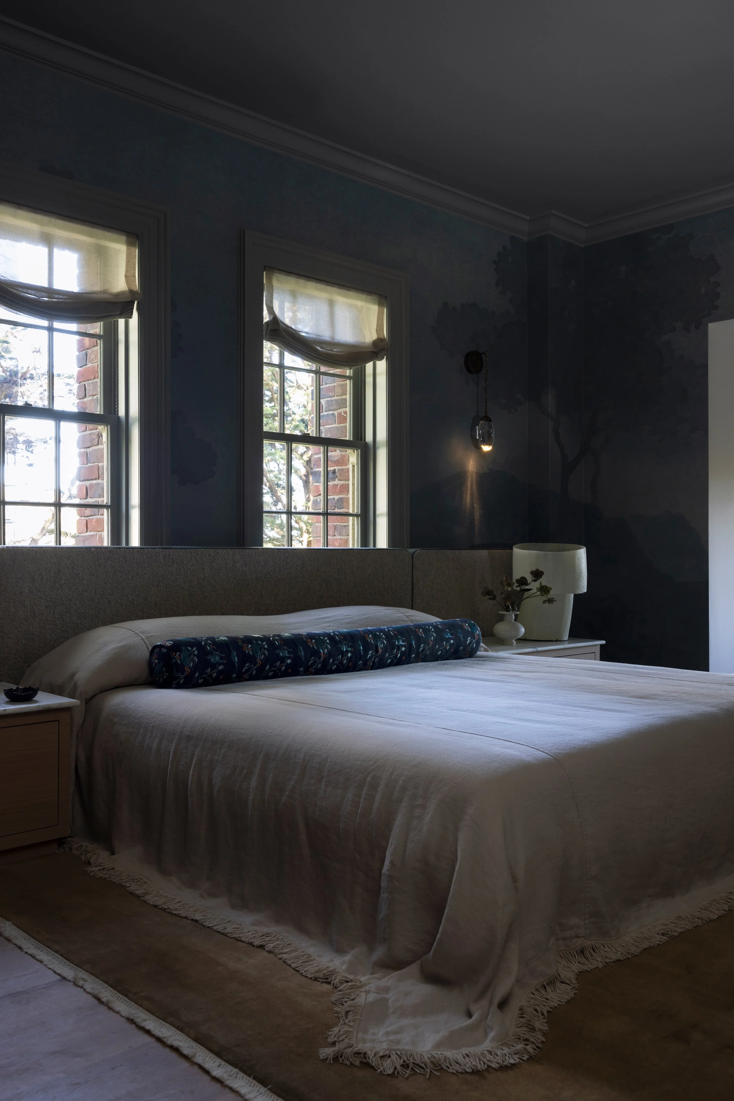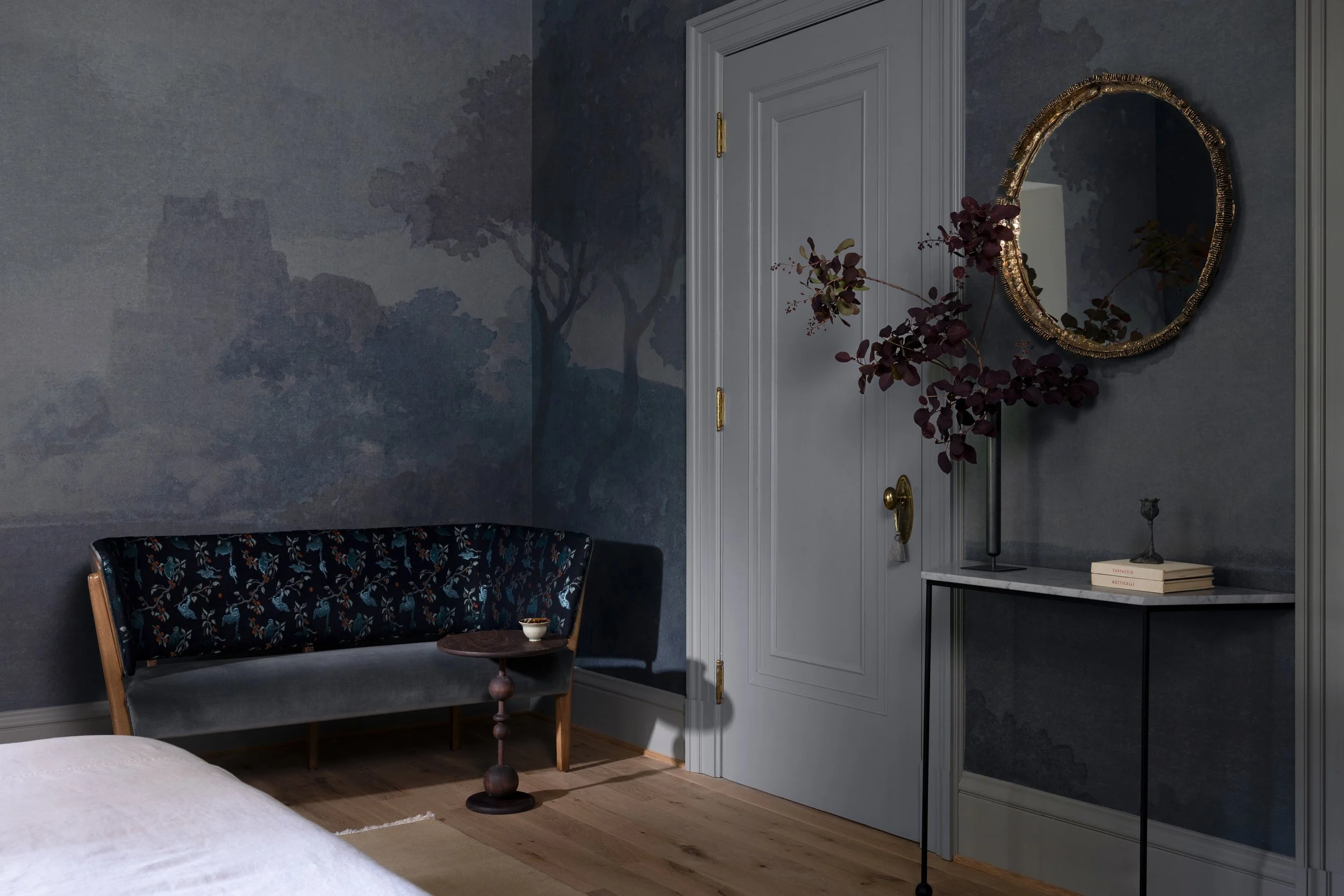 Tucked away on the mansion’s lower level, this modest bedroom of the 1899 Dutch Colonial Revival was transformed into a tranquil guest retreat for the 45th San Francisco Decorator Showcase. Drawing inspiration from the misty charm of San Francisco, the mural wallpaper provides a serene and nature- filled backdrop that sets the tone for rest and relaxation. The mix of vintage and new furnishings, along with custom and artisanally crafted decor add warmth and authenticity to the space. The kitchenette was thoughtfully upgraded, preserving the original cabinetry while elevating the space with a fresh coat of paint in a sophisticated, modern hue, and a luxurious stone countertop. The result is a seamless fusion of timeless character and contemporary elegance.